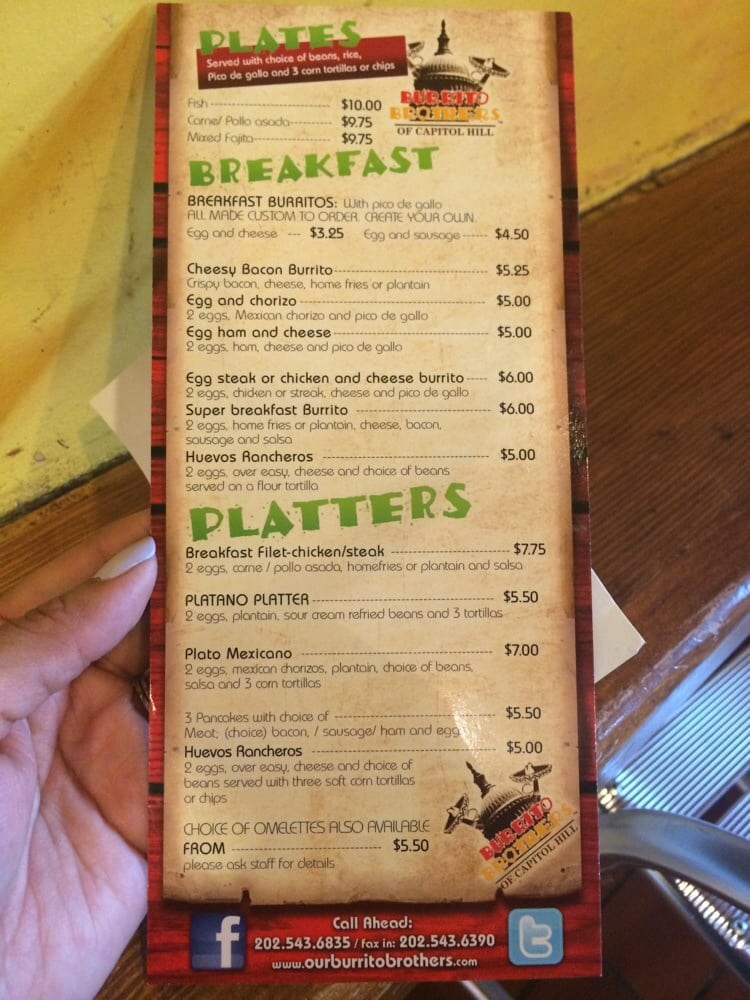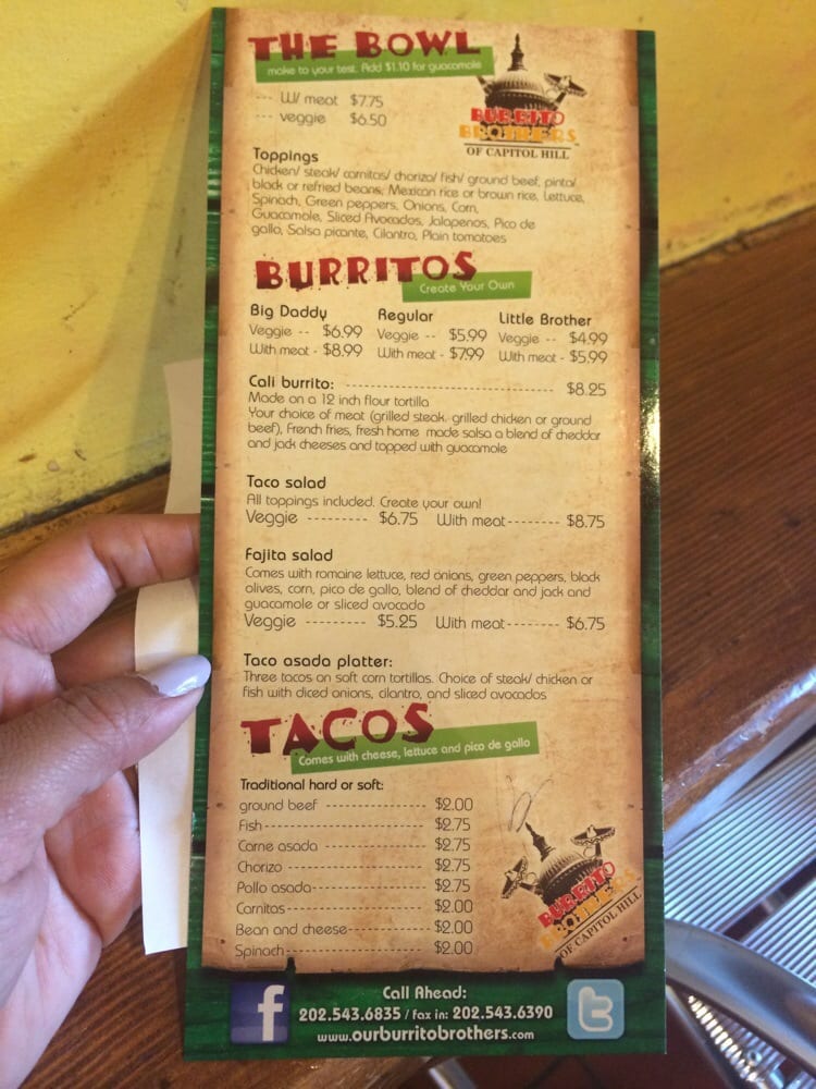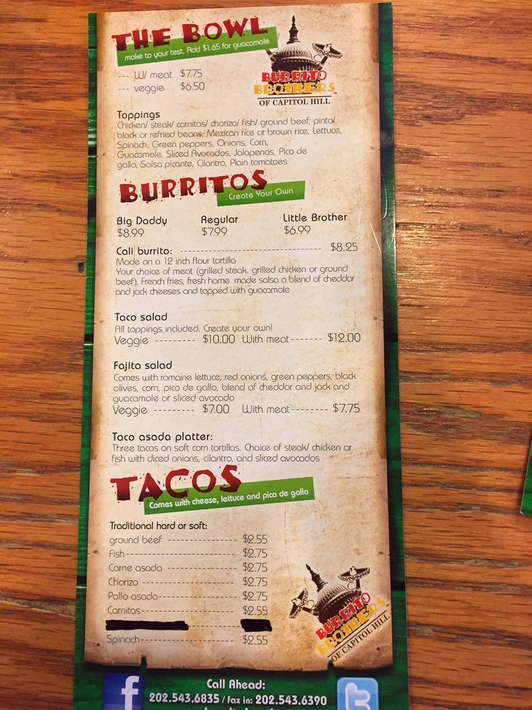 Burrito Brothers, located at 205 Pennsylvania Ave SE Washington, DC 20003, offers a casual dining experience with a focus on Tex-Mex and Mexican cuisine. With options for breakfast, brunch, lunch, and dinner, this spot is perfect for a quick meal or gathering with friends. The menu features vegan and vegetarian options, as well as happy hour specials and alcoholic beverages. Customers praise the generous portion sizes, especially the monstrous burritos, and the tasty breakfast dishes like the breakfast burrito with guacamole. The staff are known for being friendly and efficient, making for a pleasant dining experience. While some customers have noted inconsistencies in their dishes, overall, Burrito Brothers seems to be a popular choice for those looking for good food at a great price in the area.